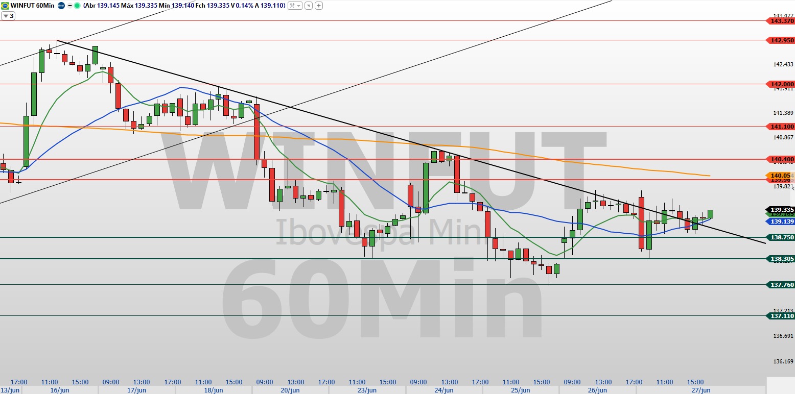 No gráfico de 60 minutos, a configuração técnica também sinaliza possibilidade de continuidade da alta no curto prazo. O mini-índice rompeu a linha de tendência de baixa (LTB) e encerrou a sessão acima das médias móveis de 9 e 21 períodos, o que fortalece o viés altista. A superação dessas referências indica que os compradores voltaram a atuar com mais força, buscando retomar o controle direcional do mercado.