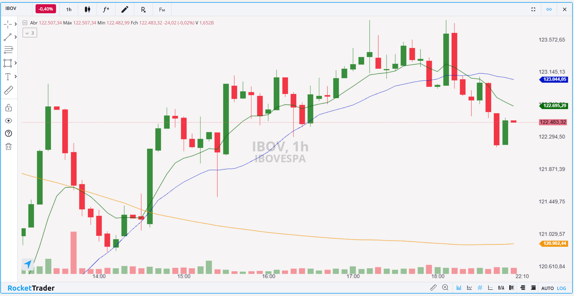 O Ibovespa encerrou a última sessão em baixa de 0,40%, aos 122.483 pontos, com mínima de 122.159 e máxima de 123.958 pontos. Essa foi a segunda queda seguida, confirmando um movimento de correção após as altas recentes. No gráfico semanal, o índice segue em disputa entre compradores e vendedores, o que coloca em risco a sequência de três semanas consecutivas de alta.