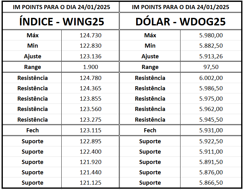 Os contratos de minidólar (WDOG25), com vencimento em fevereiro, encerraram a última sessão com uma queda de 0,34%, para 5.931 pontos. Os principais suportes estão em 5.930/5.920 (1), 5.907/5.891 (2) e 5.870/5.858 (3), enquanto as resistências encontram-se em 5.948/5.970 (1), 5.990/6.000 (2) e 6.011/ 6.030 (3).