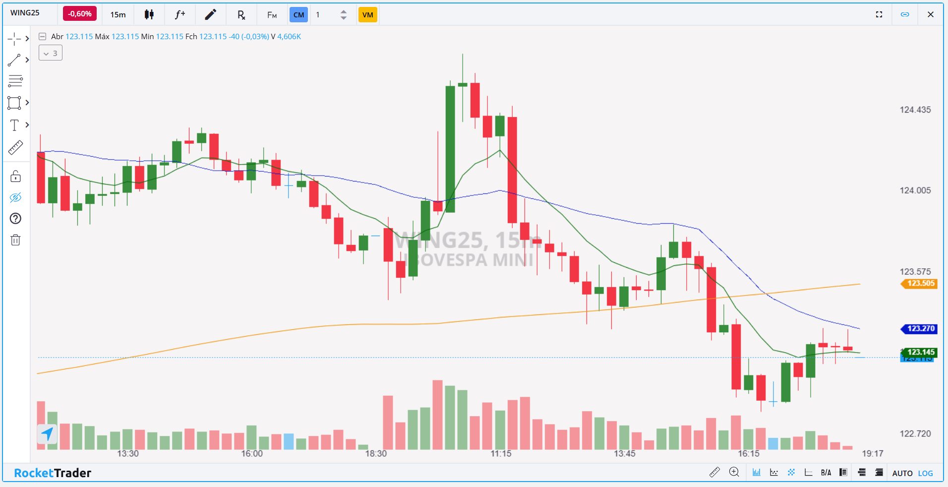 O mini-índice voltou a registrar queda pelo segundo pregão consecutivo, encerrando abaixo das médias móveis no gráfico de 15 minutos, o que reforça o viés vendedor no curto prazo. Para que a baixa se intensifique, será necessário romper o suporte em 122.875/122.600, abrindo espaço para os alvos mais baixos. Caso o fluxo comprador ganhe força, o rompimento da resistência em 123.280/123.460 poderá direcionar o índice para faixas mais altas.